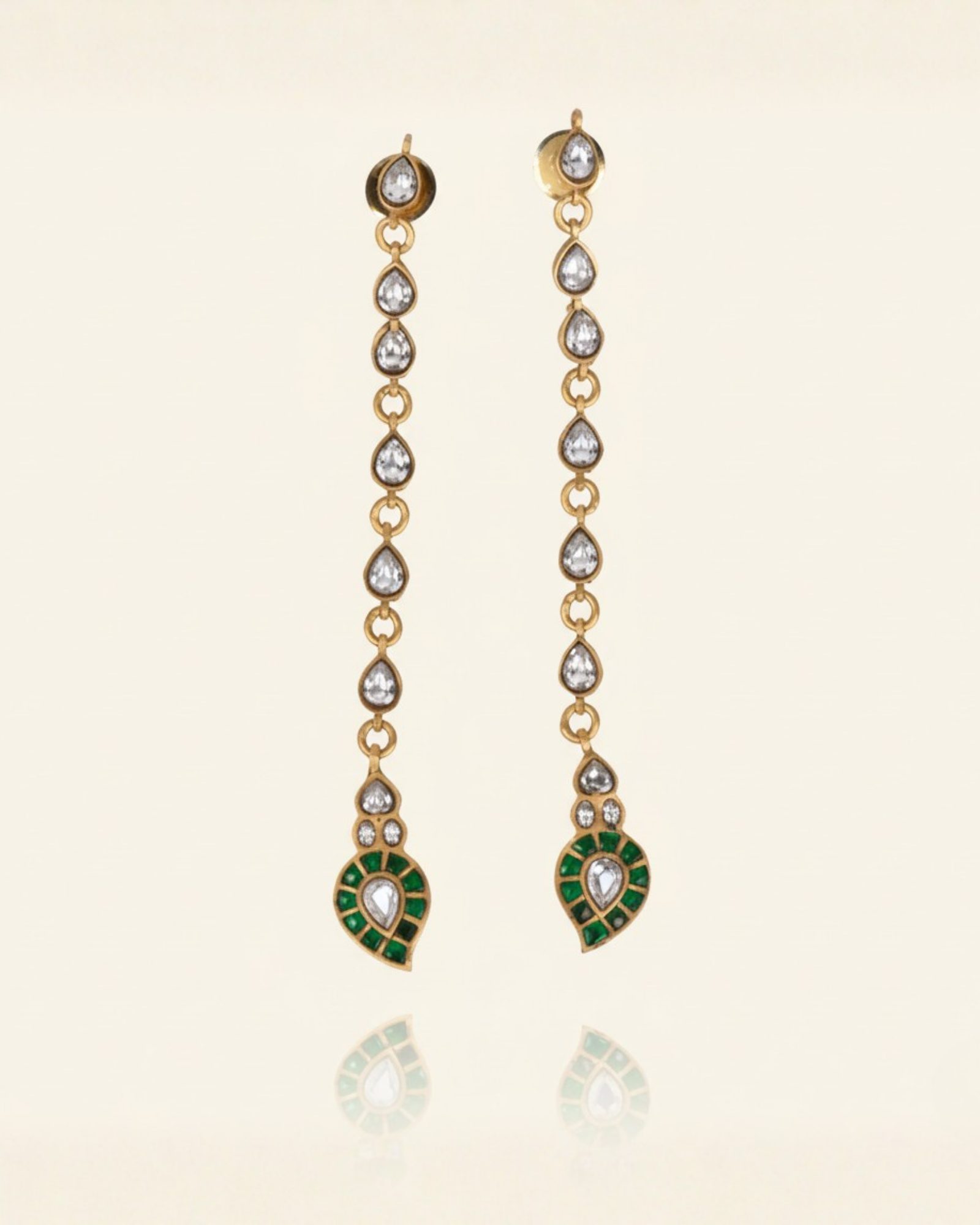 Kundan-style bezel setting: articulated pear-link cascade with emerald-halo tip pendant